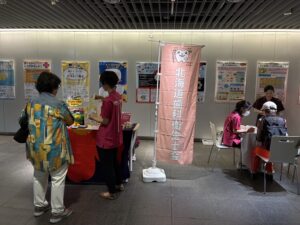 今回のおくちのけんこう展では、体験型として歯科衛生士のお仕事体験コーナー、オーラルフレイルチェック、また、15枚のポスター、歯科用防災グッズの展示などを行いました。このために足をお運び下さった方はもちろん、通りがかりの方にも多く関心を持っていただくことができ、大変充実したイベントとなりました。北海道子供の歯を守る会のブースでは、フッ化物についての説明とノベルティの配布を行っており、お子さんのいる大人の方のみならず、幅広い年齢層の方々が真剣に話を聞いておりました。