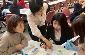 誰にでも起こりうるお口の“フレイル(虚弱)”について理解を深めるために、宮城高等歯科衛生士学院(宮城県仙台市)より、教務主任・歯学博士・歯科衛生士の小原由紀先生をお招きして「口腔機能低下症の超基礎」研修会を会場とWebにて同時開催いたしました。この研修会では、口腔機能低下症の基礎から保険算定とアセスメント、会場参加の方には検査方法と検査の時の具体的な声掛けやポイントも実践的に学びました。学生の皆さんも多くご参加いただき、舌圧測定、ムーカスの取り扱い方、オーラルディアドコキネシス、改訂水飲みテストなどを実践的に学びました。