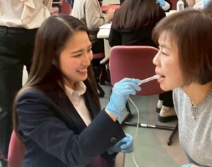誰にでも起こりうるお口の“フレイル(虚弱)”について理解を深めるために、宮城高等歯科衛生士学院(宮城県仙台市)より、教務主任・歯学博士・歯科衛生士の小原由紀先生をお招きして「口腔機能低下症の超基礎」研修会を会場とWebにて同時開催いたしました。この研修会では、口腔機能低下症の基礎から保険算定とアセスメント、会場参加の方には検査方法と検査の時の具体的な声掛けやポイントも実践的に学びました。学生の皆さんも多くご参加いただき、舌圧測定、ムーカスの取り扱い方、オーラルディアドコキネシス、改訂水飲みテストなどを実践的に学びました。
