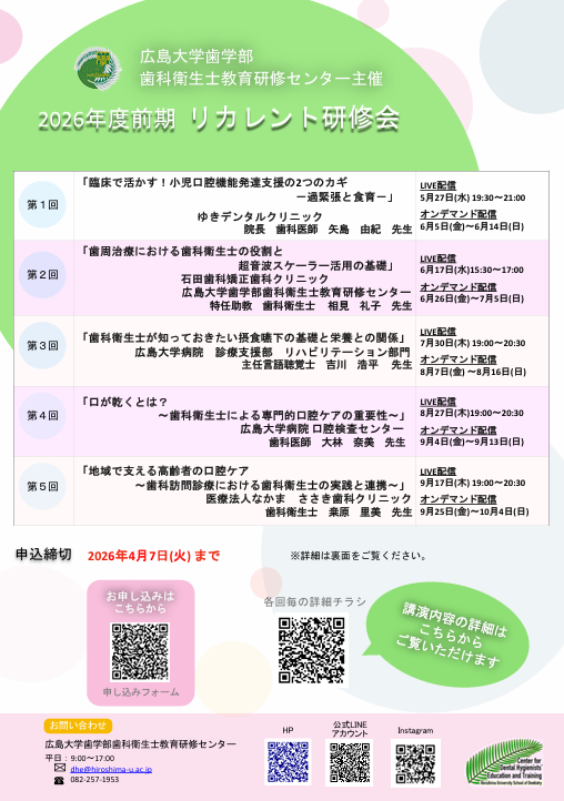 広島大学歯学部歯科衛生士教育研修センターより研修会のお知らせがありましたので、ご案内いたします。