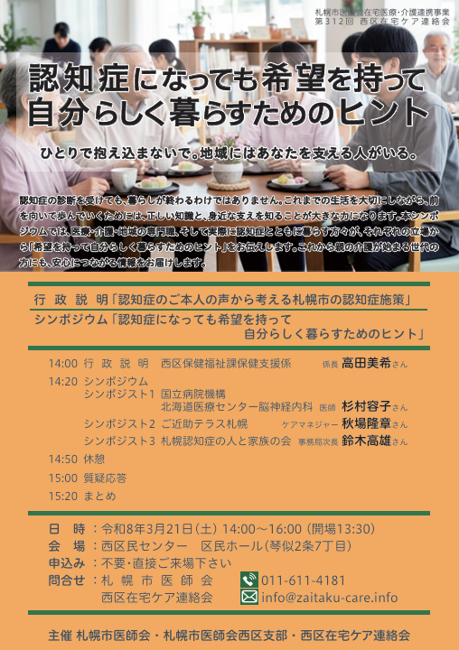 札幌市医師会より「令和7年度市民向け在宅医療・介護連携シンポジウム」開催のお知らせがありましたので、ご案内いたします。