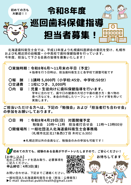 令和8年度公衆衛生活動ならびに巡回歯科保健指導にご参加いただく会員を募集しています。