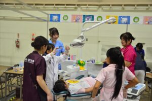 職業体験は1グループに1人歯科医師がついて、う蝕部分がつくられた石膏模型に実際の充填器とペーストを使い照射器で固めるところまで。フッ化物塗布は歯科医師の口腔内診査後、私たち歯科衛生士が実地指導をしながら行いました。普段検診に行っていないお子さんもこんなイベントの機会だからこそ、お口の様子を知ってもらい、保護者の方に検診の大切さを伝えられる貴重な時間でした。フォトブースでは可愛い子供サイズのスクラブが人気で、模型&歯ブラシを持ってお子さん達が笑顔で写真を撮ってもらっていました。また多くの来場者で歯科ブースも混雑しましたが、函館歯科衛生士専門学校の学生の方々にお手伝いいただき大変助かりました。